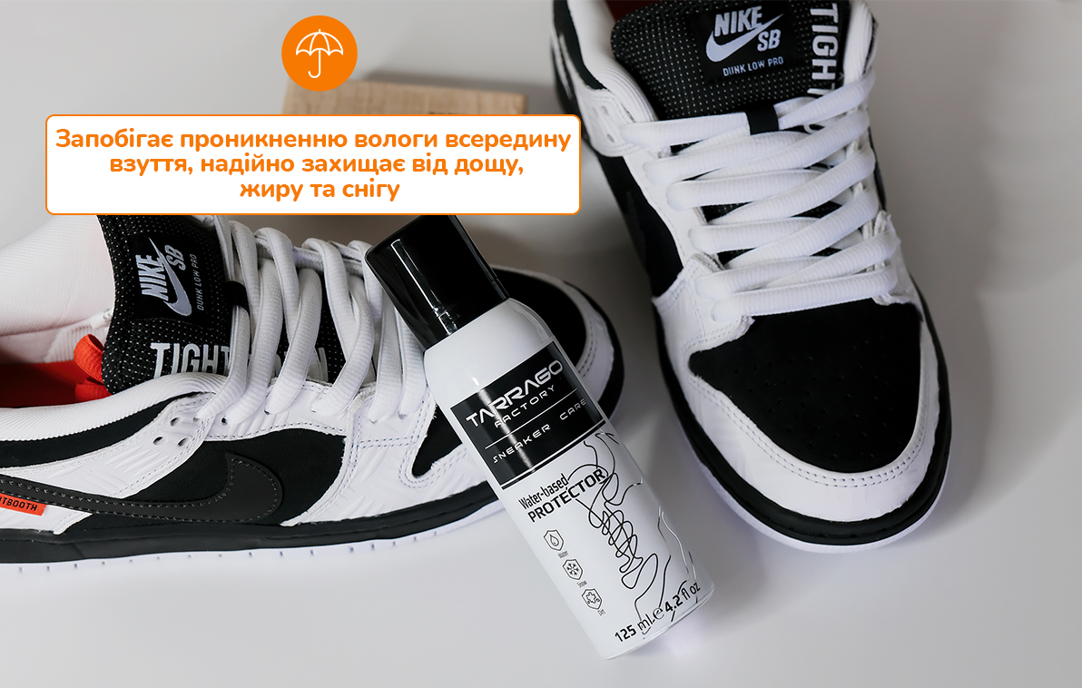 Tarrago Sneakers Protector — це сучасний спрей на водній основі, який створює ефективний захист для кросівок, одягу та аксесуарів. Формула, розроблена на основі 80% натуральних компонентів, утворює невидимий дихаючий бар’єр, що відштовхує воду, сніг, бруд, олійні плями та напої.